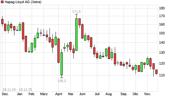 Mit dem Rücksetzer auf 112,50 EUR hat die Hapag-Lloyd-Aktie (ISIN DE000HLAG475) am 17.11.2025 ein neues 12-Monats-Tief erreicht und damit den Kurs vom 30.09.2025 eingestellt.