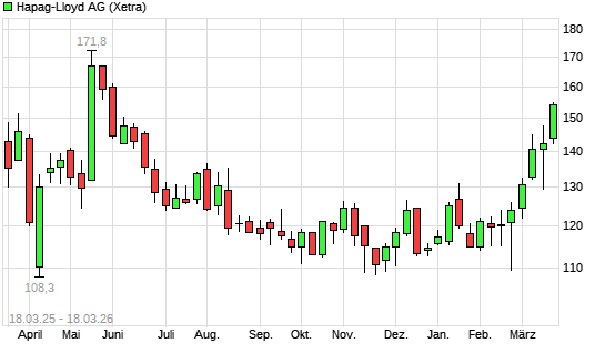 Mit dem Anstieg auf 154,80 EUR hat die Hapag-Lloyd-Aktie (ISIN DE000HLAG475) am 17.03.2026 ein neues 6-Monats-Hoch erreicht und damit den Kurs vom 16.03.2026 eingestellt.