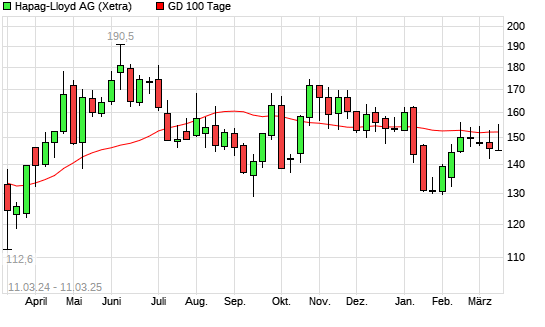 Mit dem Anstieg auf 153,60 EUR hat die Hapag-Lloyd-Aktie am 10.03.2025 die 100-Tage-Linie nach oben gekreuzt.