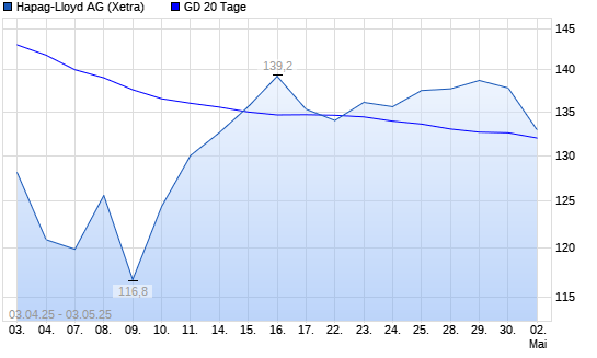 Mit dem Rücksetzer auf 133,50 EUR hat die Hapag-Lloyd-Aktie am 02.05.2025 die 20-Tage-Linie nach unten gekreuzt.