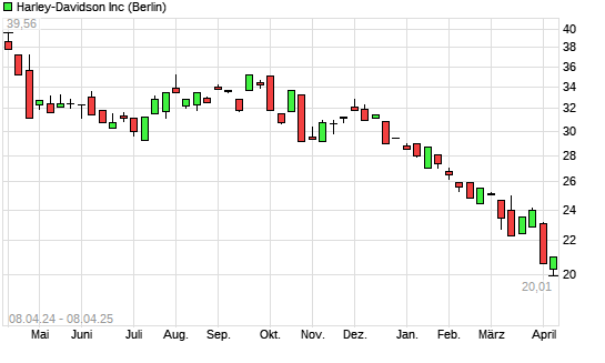 Mit dem Rücksetzer auf 19,95 EUR hat die Harley-Davidson-Aktie (ISIN US4128221086) am 07.04.2025 ein neues 3-Jahres-Tief erreicht und damit den Kurs vom 04.04.2025 eingestellt.