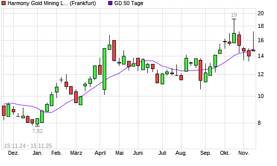 Mit dem Rücksetzer auf 14,60 EUR hat die Harmony Gold Mining-Aktie am 14.11.2025 die 50-Tage-Linie nach unten gekreuzt.