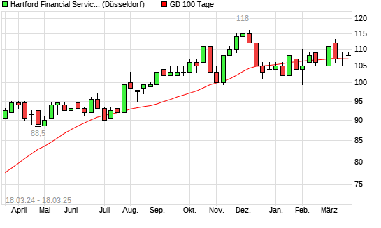 Mit dem Anstieg auf 109,00 EUR hat die Hartford Financial Services Group-Aktie am 17.03.2025 die 100-Tage-Linie nach oben gekreuzt.