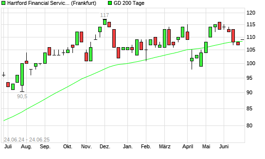 Mit dem Anstieg auf 109,00 EUR hat die Hartford Financial Services Group-Aktie am 23.06.2025 die 200-Tage-Linie nach oben gekreuzt.
