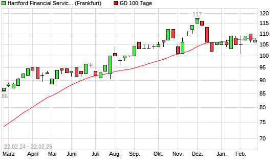 Mit dem Rücksetzer auf 107,00 EUR hat die Hartford Financial Services Group-Aktie am 21.02.2025 die 100-Tage-Linie nach unten gekreuzt.