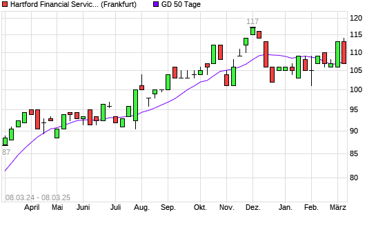 Mit dem Rücksetzer auf 107,00 EUR hat die Hartford Financial Services Group-Aktie am 07.03.2025 die 50-Tage-Linie nach unten gekreuzt.