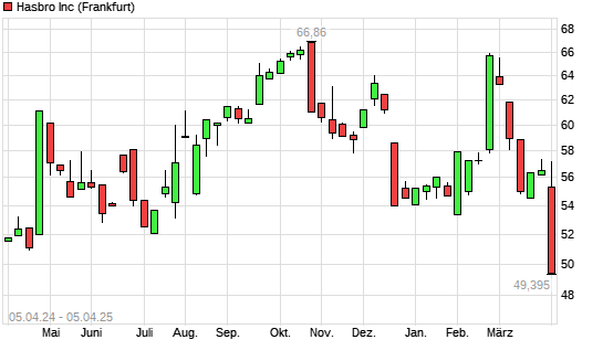 Mit dem Rücksetzer auf 49,40 EUR hat die Hasbro-Aktie (ISIN US4180561072) am 04.04.2025 ein neues 12-Monats-Tief erreicht und damit den Kurs vom 03.04.2025 eingestellt.