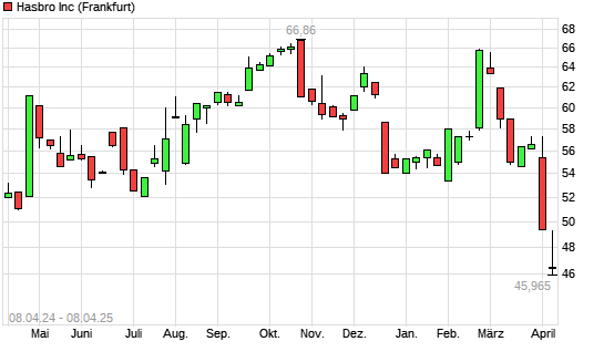 Mit dem Rücksetzer auf 49,26 EUR hat die Hasbro-Aktie (ISIN US4180561072) am 07.04.2025 ein neues 12-Monats-Tief erreicht und damit den Kurs vom 04.04.2025 eingestellt.