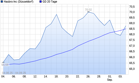 Mit dem Rücksetzer auf 67,77 EUR hat die Hasbro-Aktie am 03.09.2025 die 20-Tage-Linie nach unten gekreuzt.