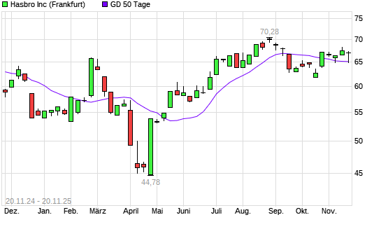 Mit dem Rücksetzer auf 64,81 EUR hat die Hasbro-Aktie am 19.11.2025 die 50-Tage-Linie nach unten gekreuzt.