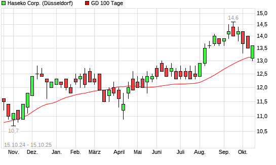 Mit dem Anstieg auf 13,60 EUR hat die Haseko-Aktie am 14.10.2025 die 100-Tage-Linie nach oben gekreuzt.