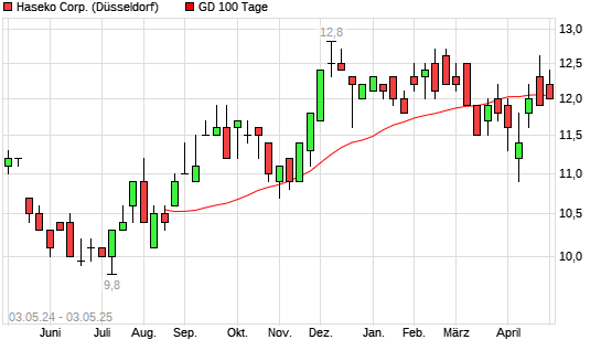 Mit dem Rücksetzer auf 12,10 EUR hat die Haseko-Aktie am 02.05.2025 die 100-Tage-Linie nach unten gekreuzt.