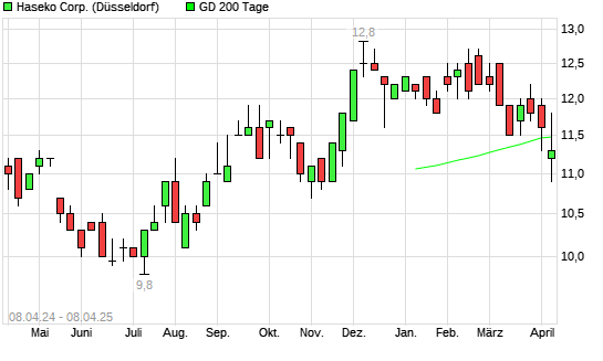 Mit dem Rücksetzer auf 11,30 EUR hat die Haseko-Aktie am 07.04.2025 die 200-Tage-Linie nach unten gekreuzt.