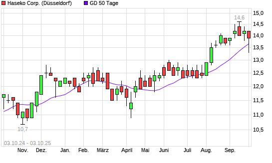 Mit dem Rücksetzer auf 13,60 EUR hat die Haseko-Aktie am 02.10.2025 die 50-Tage-Linie nach unten gekreuzt.