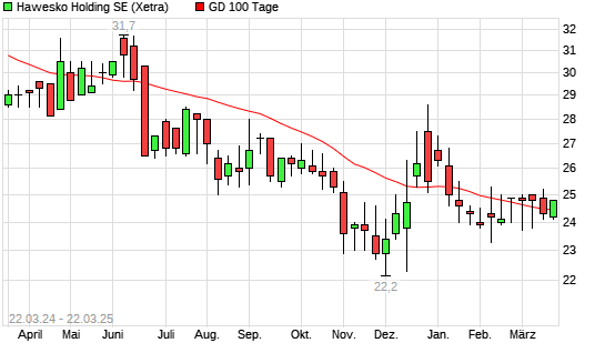 Mit dem Rücksetzer auf 24,00 EUR hat die Hawesko Holding-Aktie am 21.03.2025 die 100-Tage-Linie nach unten gekreuzt.