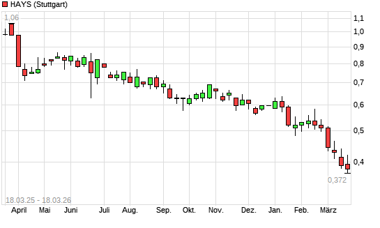Mit dem Rücksetzer auf 0,38 EUR hat die Hays-Aktie (ISIN GB0004161021) am 17.03.2026 ein neues All-Time-Low erreicht und damit den Kurs vom 13.03.2026 eingestellt.