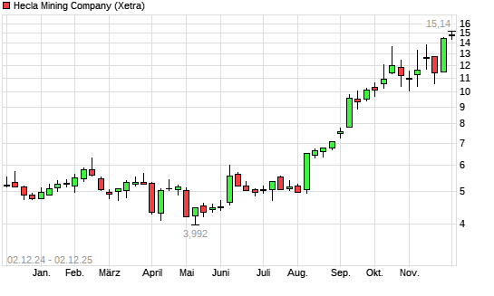 Mit dem Anstieg auf 14,72 EUR hat die Hecla Mining-Aktie (ISIN US4227041062) am 01.12.2025 ein neues All-Time-High erreicht und damit den Kurs vom 28.11.2025 eingestellt.