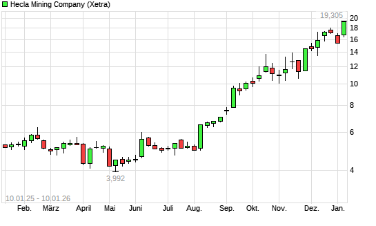 Mit dem Anstieg auf 19,26 EUR hat die Hecla Mining-Aktie (ISIN US4227041062) am 09.01.2026 ein neues All-Time-High erreicht und damit den Kurs vom 06.01.2026 eingestellt.