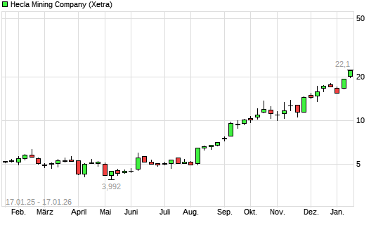 Mit dem Anstieg auf 22,77 EUR hat die Hecla Mining-Aktie (ISIN US4227041062) am 16.01.2026 ein neues All-Time-High erreicht und damit den Kurs vom 15.01.2026 eingestellt.