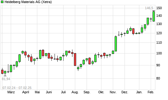 Mit dem Anstieg auf 143,60 EUR hat die Heidelberg Materials-Aktie (ISIN DE0006047004) am 06.02.2025 ein neues All-Time-High erreicht und damit den Kurs vom 24.01.2025 eingestellt.