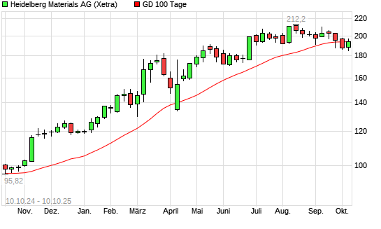 Mit dem Anstieg auf 195,00 EUR hat die Heidelberg Materials-Aktie am 09.10.2025 die 100-Tage-Linie nach oben gekreuzt.