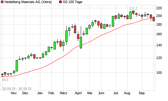 Mit dem Rücksetzer auf 189,35 EUR hat die Heidelberg Materials-Aktie am 29.09.2025 die 100-Tage-Linie nach unten gekreuzt.