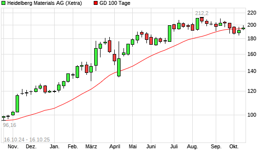 Mit dem Rücksetzer auf 194,45 EUR hat die Heidelberg Materials-Aktie am 15.10.2025 die 100-Tage-Linie nach unten gekreuzt.
