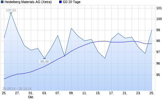 Mit dem Rücksetzer auf 96,70 EUR hat die Heidelberg Materials-Aktie am 24.10.2024 die 20-Tage-Linie nach unten gekreuzt.
