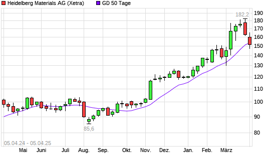 Mit dem Rücksetzer auf 150,00 EUR hat die Heidelberg Materials-Aktie am 04.04.2025 die 50-Tage-Linie nach unten gekreuzt.