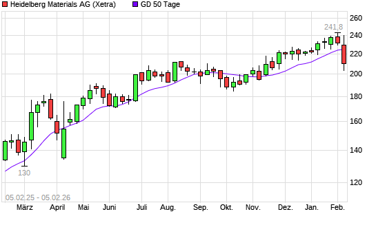 Mit dem Rücksetzer auf 214,70 EUR hat die Heidelberg Materials-Aktie am 04.02.2026 die 50-Tage-Linie nach unten gekreuzt.