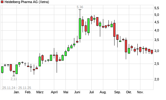 Mit dem Rücksetzer auf 2,78 EUR hat die Heidelberg Pharma-Aktie (ISIN DE000A11QVV0) am 24.11.2025 ein neues 6-Monats-Tief erreicht und damit den Kurs vom 21.10.2025 eingestellt.