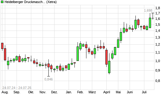 Mit dem Anstieg auf 1,69 EUR hat die Heidelberger Druckmaschinen-Aktie (ISIN DE0007314007) am 23.07.2025 ein neues 12-Monats-Hoch erreicht und damit den Kurs vom 11.06.2025 eingestellt.