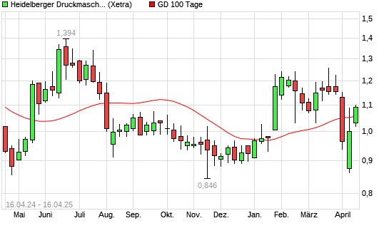 Mit dem Anstieg auf 1,08 EUR hat die Heidelberger Druckmaschinen-Aktie am 15.04.2025 die 100-Tage-Linie nach oben gekreuzt.