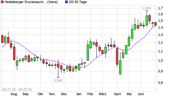 Mit dem Rücksetzer auf 1,43 EUR hat die Heidelberger Druckmaschinen-Aktie am 04.07.2025 die 50-Tage-Linie nach unten gekreuzt.