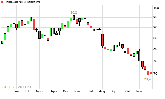 Mit dem Rücksetzer auf 69,30 EUR hat die Heineken-Aktie (ISIN NL0000009165) am 27.11.2024 ein neues 5-Jahres-Tief erreicht und damit den Kurs vom 22.11.2024 eingestellt.