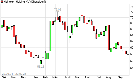 Mit dem Rücksetzer auf 58,05 EUR hat die Heineken Holding-Aktie (ISIN NL0000008977) am 22.09.2025 ein neues 6-Monats-Tief erreicht und damit den Kurs vom 19.09.2025 eingestellt.