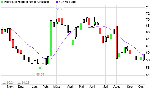 Mit dem Anstieg auf 59,60 EUR hat die Heineken Holding-Aktie am 10.10.2025 die 50-Tage-Linie nach oben gekreuzt.