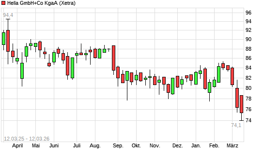 Mit dem Rücksetzer auf 74,30 EUR hat die Hella-Aktie (ISIN DE000A13SX22) am 11.03.2026 ein neues 12-Monats-Tief erreicht und damit den Kurs vom 09.03.2026 eingestellt.