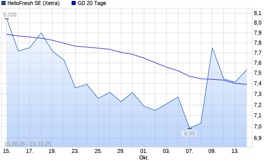 Mit dem Anstieg auf 7,50 EUR hat die HelloFresh-Aktie am 14.10.2025 die 20-Tage-Linie nach oben gekreuzt.