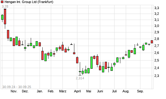 Mit dem Anstieg auf 2,75 EUR hat die Hengan International Group-Aktie (ISIN KYG4402L1510) am 29.09.2025 ein neues 6-Monats-Hoch erreicht und damit den Kurs vom 18.09.2025 eingestellt.