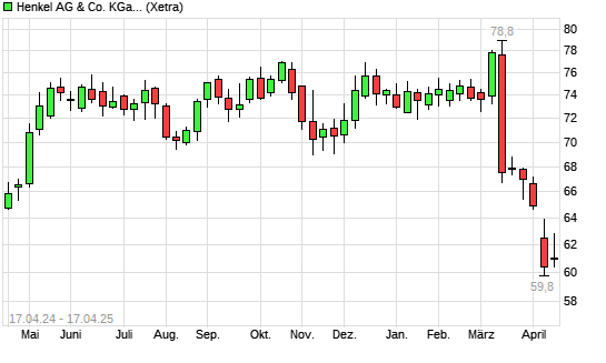 Mit dem Rücksetzer auf 60,90 EUR hat die Henkel St-Aktie (ISIN DE0006048408) am 16.04.2025 ein neues 12-Monats-Tief erreicht und damit den Kurs vom 11.04.2025 eingestellt.
