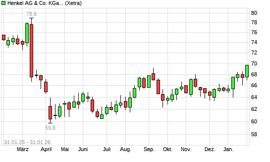Mit dem Anstieg auf 69,50 EUR hat die Henkel St-Aktie (ISIN DE0006048408) am 30.01.2026 ein neues 6-Monats-Hoch erreicht und damit den Kurs vom 26.01.2026 eingestellt.