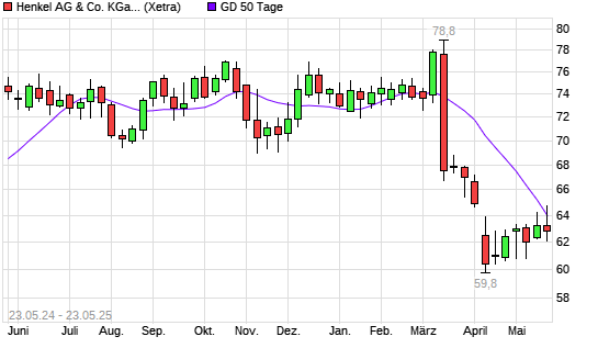 Mit dem Rücksetzer auf 63,50 EUR hat die Henkel St-Aktie am 22.05.2025 die 50-Tage-Linie nach unten gekreuzt.