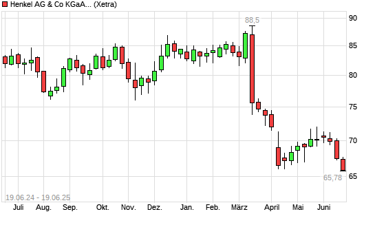 Mit dem Rücksetzer auf 66,34 EUR hat die Henkel Vz-Aktie (ISIN DE0006048432) am 18.06.2025 ein neues 12-Monats-Tief erreicht und damit den Kurs vom 17.06.2025 eingestellt.