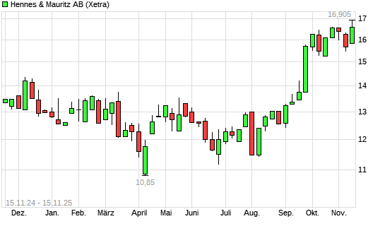 Mit dem Anstieg auf 16,73 EUR hat die Hennes & Mauritz-Aktie (ISIN SE0000106270) am 14.11.2025 ein neues 12-Monats-Hoch erreicht und damit den Kurs vom 24.10.2025 eingestellt.