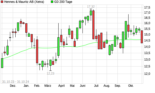 Mit dem Rücksetzer auf 14,31 EUR hat die Hennes & Mauritz-Aktie am 30.10.2024 die 200-Tage-Linie nach unten gekreuzt.