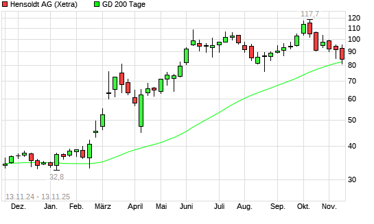 Mit dem Rücksetzer auf 82,75 EUR hat die Hensoldt-Aktie am 12.11.2025 die 200-Tage-Linie nach unten gekreuzt.