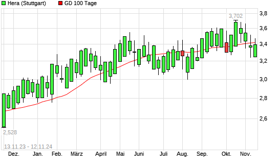 Mit dem Anstieg auf 3,42 EUR hat die Hera-Aktie am 11.11.2024 die 100-Tage-Linie nach oben gekreuzt.