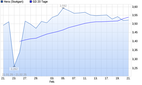 Mit dem Rücksetzer auf 3,46 EUR hat die Hera-Aktie am 20.02.2025 die 20-Tage-Linie nach unten gekreuzt.