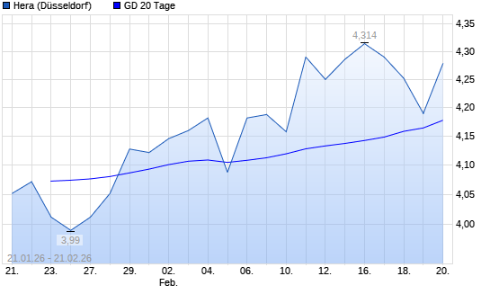 Mit dem Anstieg auf 4,21 EUR hat die Hera-Aktie am 20.02.2026 die 20-Tage-Linie nach oben gekreuzt.Die Hera-Aktie befindet sich seit dem 23.12.2025 im langfristigen Aufwärtstrend und ...weiterlesen